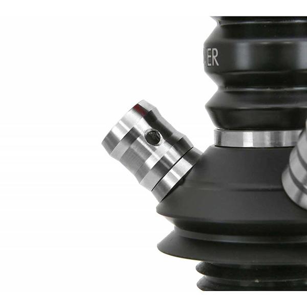 Ο ναργιλές είναι κατασκευασμένος από ανοξείδωτο ατσάλι και πλαστικά εξαρτήματα, έχει επίσης σύνδεση σωλήνα, όπως συνηθίζεται στους ρώρικους ναργιλέδες. Ερχόμαστε στη βάση, η οποία έχει πολύ ενδιαφέρον σχεδιασμό. Εκτός από τη σύνδεση του εύκαμπτου σωλήνα, έχει δύο άλλα εξαρτήματα στη βάση. Πρώτα μια βαλβίδα εξαέρωσης και έπειτα μια σύνδεση σωλήνα, η οποία χρησιμεύει ως συγκράτηση του σωλήνα. Το επιστόμιο ταιριάζει απόλυτα σε αυτό. Ας φτάσουμε στο υλικό. Ο ναργιλές έχει έναν πυρήνα από ανοξείδωτο ατσάλι που είναι επικαλυμμένος με πλαστικό, αλλά δεν είναι μόνο αυτό! Ένα ελατήριο έχει τυλιχτεί γύρω από τη στήλη καπνού, σαν αμορτισέρ από αυτοκίνητο, με πολλούς ενδιαφέρον χρωματικούς συνδυασμούς από την Mamay Customs Hookah. Ως συνήθως, ο ναργιλές εφαρμόζει στη γυάλα με ειδικό σφραγιστικό λάστιχο το οποίο εφαρμόζει τέλεια.